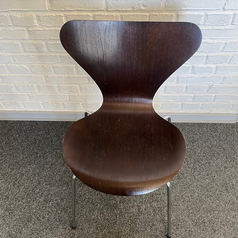 To polstret Arne Jacobsen 7’er stole sælges samlet til prisen.