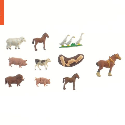 Denne pakke indeholder 10 små figurer af bondegårdsdyr, hver omkring 8 cm i størrelse. Figurerne inkluderer almindelige husdyr som heste, køer, grise og får. De er farverige og beregnet til leg eller samling.