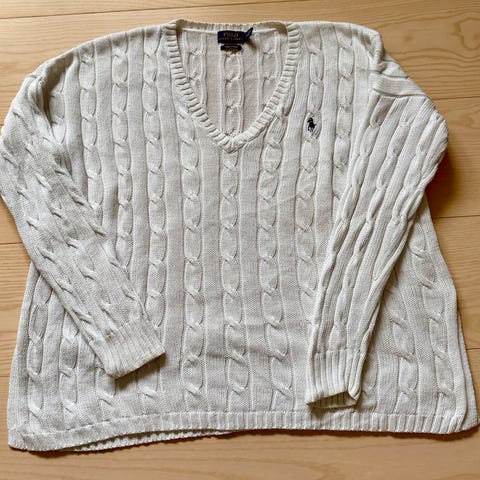 Polo Ralph Lauren sweater til kvinder i størrelse L. Strikken er i beige bomuld med klassisk kabelstrikmønster og rund hals. Ribkanter ved hals, ærmer og bund. Velegnet som hverdagsstrik