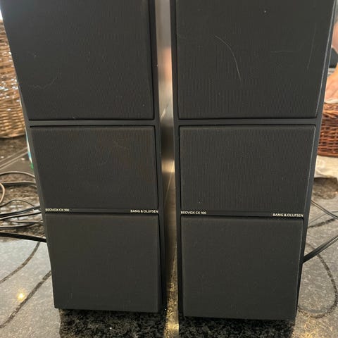 Bang & Olufsen Beovox CX100 højttalere i hvid farve. Passiv højttalermodel med en impedans på 6 ohm og en belastning på 100/115 watt. Velegnet til brug sammen med kompatible forstærkere og anlæg fra Bang & Olufsen eller andre systemer, der understøtter passive højttalere med tilsvarende specifikationer. De er i fin stand, men "striberne" på siderne er let gulned. Prisen er for 2 stk.