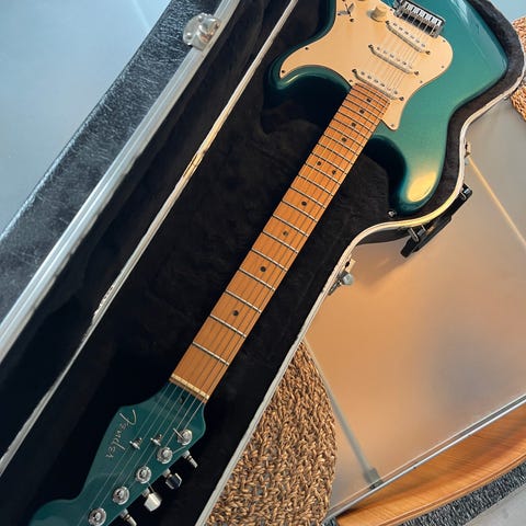Fender's flagskib fra 1993. Farven hedder Crimson Burst og har en transparent lakering. Alt er originalt på denne super Strat. 3 stk Fender Lace Sensor Gold pickups, Locking Tuners, Hipshot Tremsetter og TBX tonekontrol. Professionel ombånding samt opsætning med 0.10 Ernie Ball strenge, for 2 måneder siden. Luksus gigbag medfølger.