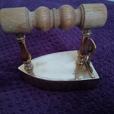 Messing strygejern med mørkt træhåndtag. Strygejernet er cirka 10 cm langt, som vist på på billede. 439 gram. Strygejernet kan åbnes bagtil så metalindsatsen efter opvarmning kan genplaceres. Velegnet som dekorativt gammeldags strygejern eller samlerobjekt.