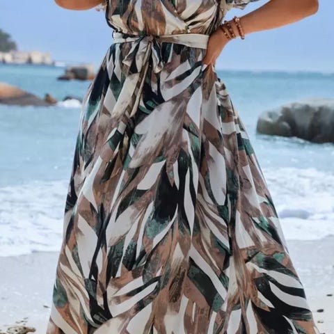 Shein sommerkjole til kvinder i størrelse XL. Kjolen er lavet i polyester og har et blåt mønster i flere nuancer. Modellen har korte ærmer, rund halsudskæring og bindebånd i taljen. Længden går cirka til anklerne. Velegnet som let sommerkjole til hverdagsbrug eller ferier.