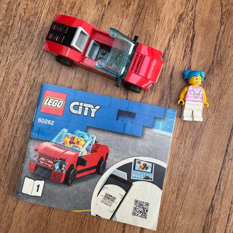 LEGO City sæt med køretøj, minifigur, lille dyrefigur og tilbehør. Sættet inkluderer også byggevejledning og original æske, som vist på billederne.