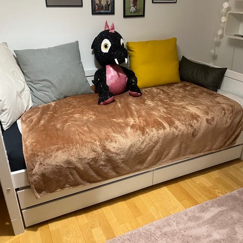 Madrassen på udtrækssengen er fra Ikea (står til 400,-).