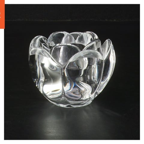 Denne genstand er en glas lysestage designet med blomsterlignende kurver. Den er lavet af klart glas, hvilket gør den transparent og reflekterende. Den har en diameter på 10 cm og kan bruges til at holde små stearinlys.