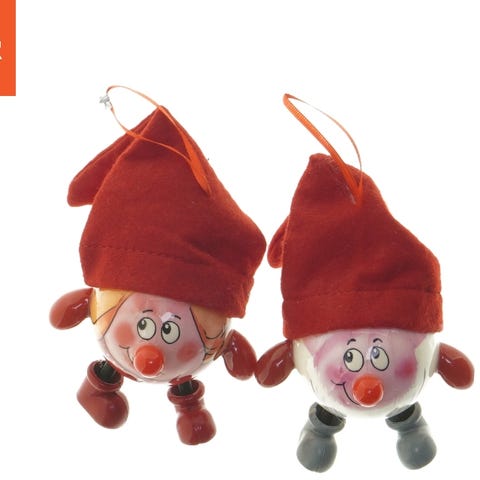 Denne samling består af to hæklede nisser med røde huer og skæg, samt en håndfuld julepynt. De hæklede nisser har grå kroppe og røde hatte, og detaljerne inkluderer små ansigter med skæg og huer. Der er også flere pyntede ornamenter formet som hjerter med rødt og grønt blomstermønster, bundet sammen med røde snore. Desuden inkluderer samlingen nogle dekorative juleelementer og en lille dukke.