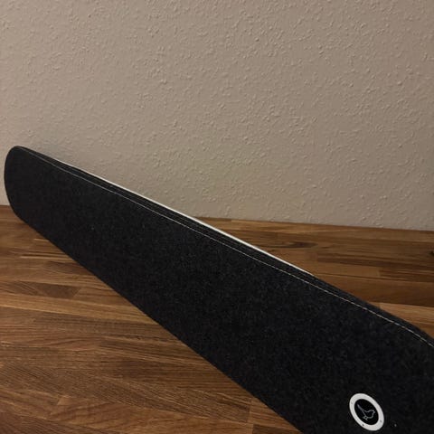 Libratone Lounge soundbar i sort og hvid. Lang, rektangulær højttaler med stofbeklædt front og diskret logo i siden. Egnet til brug sammen med tv eller som trådløs højttaler i stuen. Kan placeres på møbel eller monteres op ad væg afhængigt af opsætning og tilbehør.