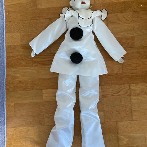 Hånddukke formet som en måge, klædt i en blå-hvid stribet skjorte. Dukken er lavet af blødt materiale med en gul næb og sorte detaljer ved øjnene. Perfekt til teaterforestillinger for børn eller som en unik dekorationsgenstand. Dukken er 23 cm stor.