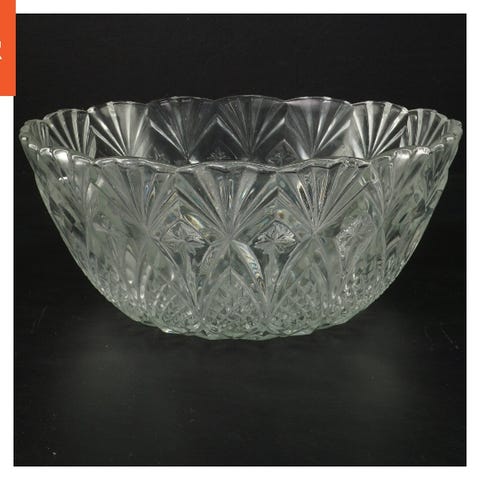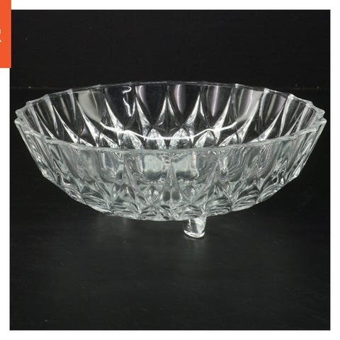 Dette er en smuk skål lavet af glas med et indviklet diamantmønster på overfladen. Skålen har en bølget kant og transparente egenskaber, der giver et elegant udseende. Den har en rund form og egner sig til servering eller dekoration. Størrelsen er angivet som Ø 21 cm.