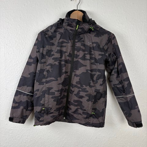 Børns regnjakke i sort med et mønster af grå stjerner indrammet i cirkler. Jakken har en hætte og er udstyret med elastiske manchetter. Den har turkisfarvede knapper og en lynlås foran. Refleksstriber på ærmerne for ekstra synlighed.