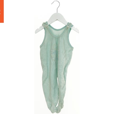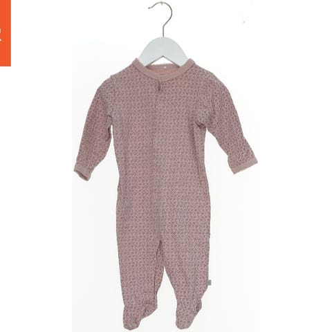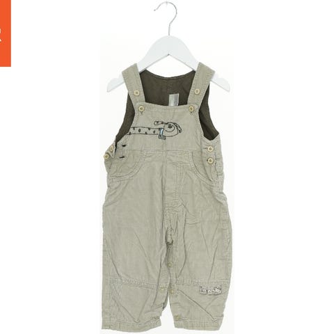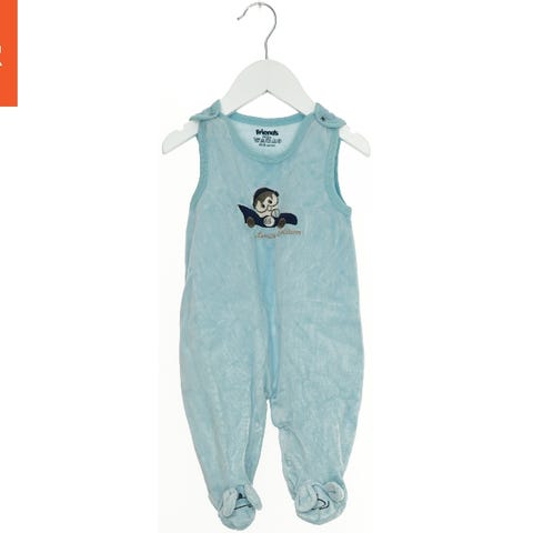 Heldragt til børn med lange ærmer og ben, dekoreret med vandrette striber i blå, brun og beige. Dragten har knapper foran og to lommer med knapdetaljer.