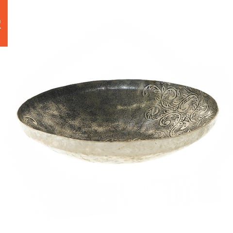 Dette er et dekorativt metal fad med fem skåle, formet som kronblade, der hver har en forskellig nuance fra brun til beige. Det er designet til at holde små genstande eller bruges som serveringsfad. Fadet har en diameter på 40 cm og reflekterer lys med sin skinnende overflade.