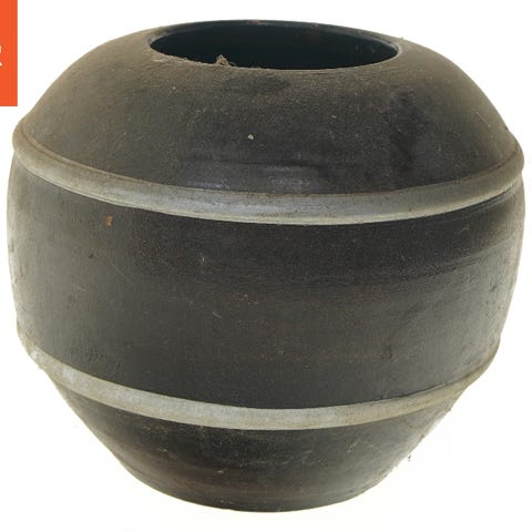 Denne vase har en traditionel og rustik stil med en glat overflade og en let cylindrisk form. Den er primært mørk brunsort og har to lysegrå or indgraverede linjer som dekoration. Der er let slid på bunden af vasen, hvilket tyder på, at den har været brugt. Vasen er 31 cm høj og ser ud til at være lavet af keramik eller ler.