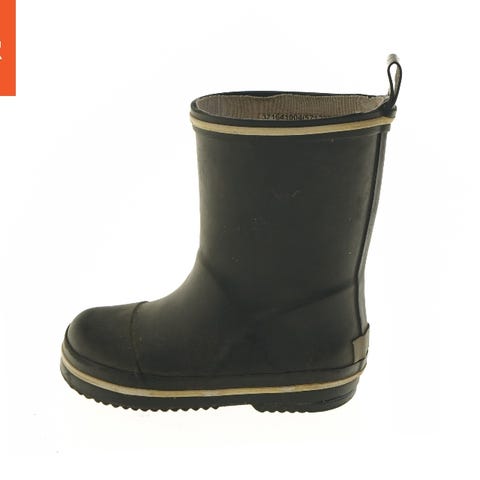 Et par sorte gummistøvler til børn i størrelse 28. Disse støvler har en rund tåform og en synlig logo på siden. De er lavet af vandafvisende materiale og har en grov ydersål for bedre greb på glatte overflader.