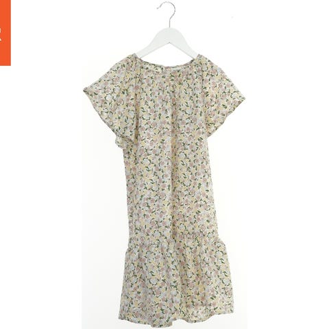 En kjole med blomstermønster i forskellige farver som blå, rød og lilla. Kjolen har trekvartlange ærmer og en rund halsudskæring. Den har en løs pasform med dekorationer som flæser nederst. Der er en lille knap i nakken til lukning. Velegnet til forskellige lejligheder.