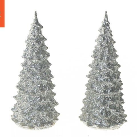 Sæt med to LED-juletræer, glitrende i en sølvfarve, til dekorativ brug. Træerne har detaljeret struktureret overflade og kommer med en LED-lyskilde, der kan tændes og slukkes via en tænd/sluk-knap i bunden.