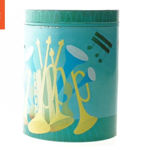 Rund metaldåse med et dekorativt motiv af engle fra Tilda. Dåsen har en diameter på 11,5 cm og en længde på 14,5 cm. Den er velegnet til opbevaring af små genstande eller som pyntegenstand. Dåsen har et låg, der passer godt til basen, og indvendigt har dåsen en metallisk finish.