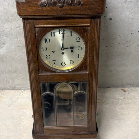 Flot vægur med pendul i mørk træramme. Uret har hvid urskive og pendulet kan følges gennem den smukke glaslåge. Egnet som klassisk vægur til ophængning. Uret har time og kvarterslag, denne funktion kan slås fra.
