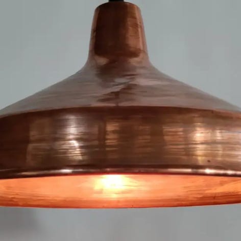 Dette er et sæt af to pendellamper lavet af kobber med geometrisk design. Lampeskærmene er lavet af kobbertråde i en dekorativ geometrisk form, som skaber et stilfuldt udseende. Lampen leveres med ledning og fatning til montering, og ledningerne er i god stand. Disse lamper vil tilføje en moderne og elegant berøring til ethvert rum.