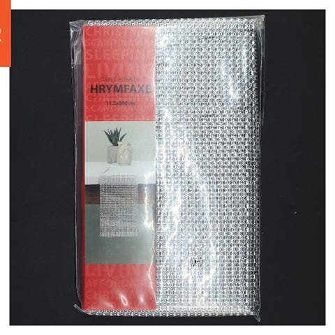 En sølvfarvet bordløber af mærket HRYMFAXE, der måler 11,5x200 cm. Produktet er stadig i sin originale emballage og lader til at være lavet af plastmateriale, med en dekorativ glitrende overflade, ideel til at tilføje et touch af elegance til enhver borddækning. Bruges typisk til festlige lejligheder.