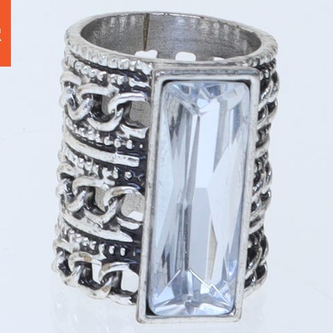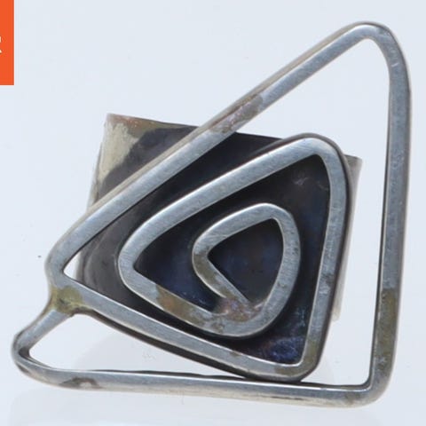 Sølvring dekoreret med en mørk, rund sten i midten. Designet inkluderer detaljerede mønstre på siderne af ringen. Ringen har en størrelse på 55 mm.