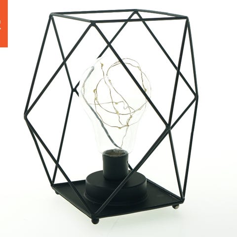 Denne bordlampe har en cylindrisk, mønstret lampeskærm, der tillader lys at passere igennem i fine mønstre. Lampen står på tre ben lavet af træ eller et træ-lignende materiale med en afslappet og naturlig finish. Den er udstyret med en elektrisk ledning med stikkontakt til strømforsyning. Lampens dimensioner er 52 cm i højde og 20 cm i diameter.