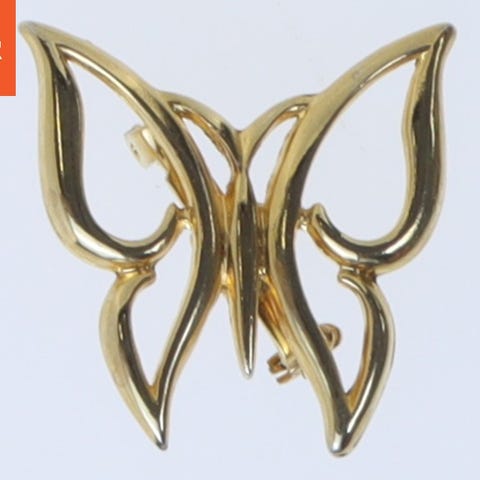 Denne genstand er en dekorativ broche formet som en fugl. Brochen er 5 cm i længden og er i farverne rød, gylden og sølv. Forsiden af fuglen er dækket med små glitrende sten, og der er en grøn sten der repræsenterer øjet. Brochen har en spids næb og detaljerede fjer, der er fremhævet i en gylden farve. Bagsiden af brochen fremviser en nålelukning, der gør det muligt at fastgøre brochen til beklædningsgenstande.