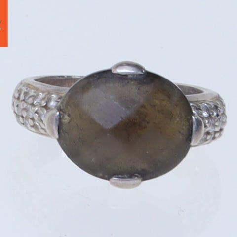 Ringen er lavet af sølvfarvet metal og har et dekorativt smykkedesign. Den centrale del af ringen har en stor, rektangulær ædelsten eller glassten, der giver et skinnende udtryk. Metalbåndet har et kæde-lignende mønster rundt om stenen og er cirka 48 mm i størrelse.