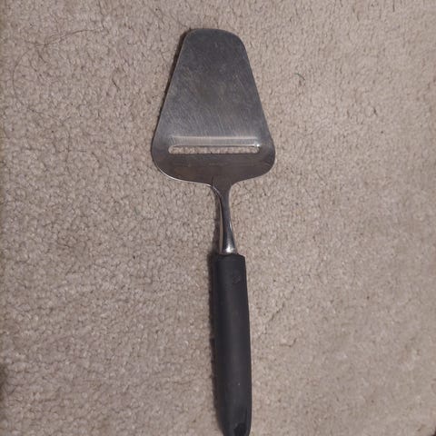 Dette er en ostehøvl med et ergonomisk håndtag, som sandsynligvis er designet til komfortabelt greb. Skærehovedet er lavet af rustfrit stål, hvilket gør det robust og stabilt til skæring af osteskiver. Den medfølgende etiket kan indikere produktoplysninger og instruktioner.