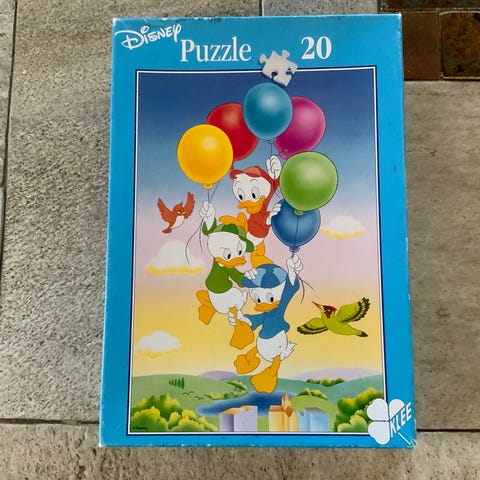 Dette er et billedpuslespil bestående af 25 brikker lavet af træ. Motivet viser karaktererne Anders And og Joakim von And fra Disney-universet. Puslespillet kommer i en æske, der ligeledes har motivet trykt på låget. Æsken har synlige brugsspor, men brikkerne virker intakte og passende til børn. Tags: puslespil, Anders And, Disney