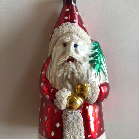 Sød, lang, tynd julemand i rødt tøj, rød hue, langt hvidt skæg og to sorte øjne.