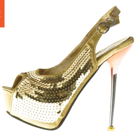Disse stilfulde stilethæle har en gylden farve og er prydet med små glitrende sten. De har en høj hæl og en platform for ekstra komfort. Skoene er i størrelse 37 og har en lukket tå. Ideelle til festlige lejligheder eller en aften ude.