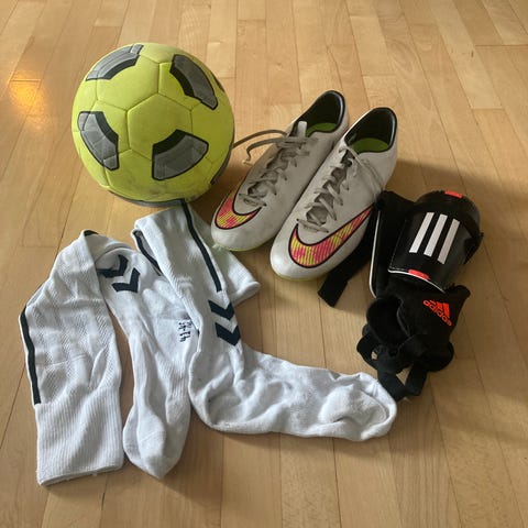 Fodboldpakke med udstyr til fodbold. Pakken indeholder et par fodboldstøvler med knopper, flere par fodboldstrømper i forskellige farver, et sæt benskinner med ankelbeskyttere samt et par målmandshandsker i orange og blå. Velegnet som samlet sæt til fodboldtræning og kamp på græs eller kunstgræs.