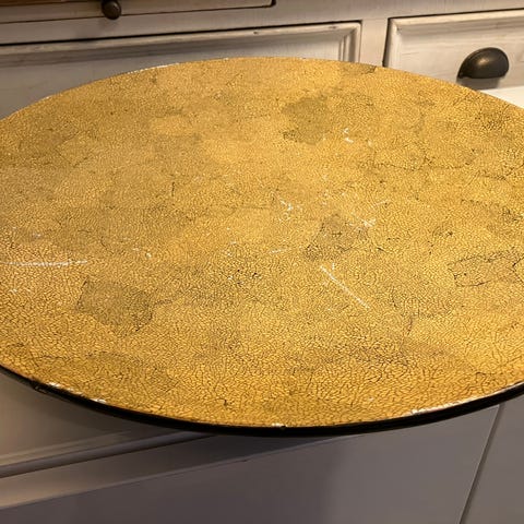 Rundt lakfad med guldfarvet Overflade sort underside.