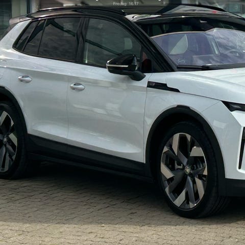 Škoda Enyaq elbil blå SUV panoramatag brun kabine
