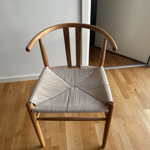 Egetræ og flet. På stolene er der monteret møbelsko.