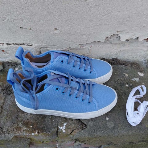 Der medfølger både lyseblå snørrebånd + et par i hvide.