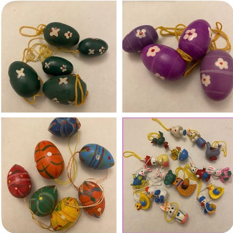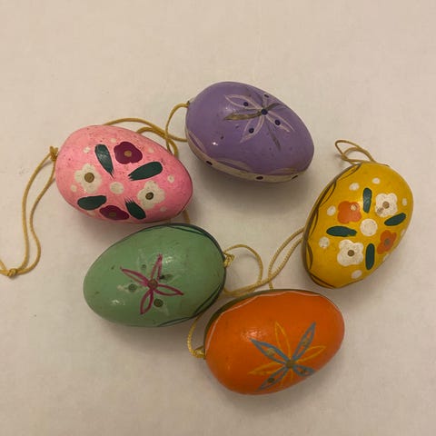Vintage påskepynt, 6 stk. træ påskeæg med udskæring