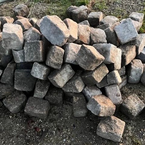 Brosten i granit i blandede nuancer af grå og rosa. Stenene er tilhugget i kubiske blokke, velegnet til belægning, kantafgrænsning, indkørsler, stier eller dekorative formål i haven. Leveres som løse sten i blandet størrelsessortering efter billederne.