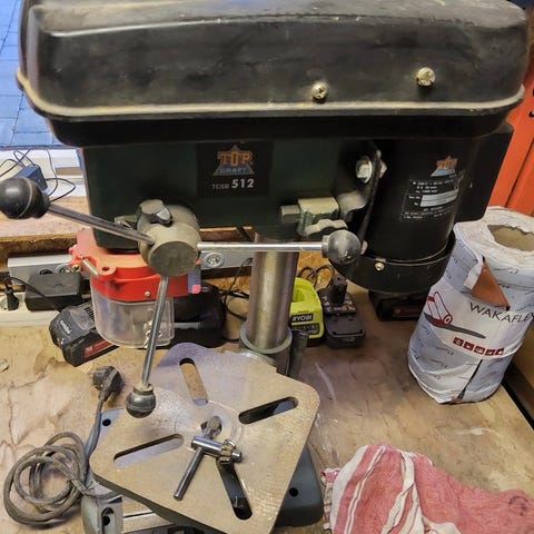 TBM 700L søjleboremaskine i grøn farve. Maskinen er monteret på søjle med højdejusterbart bord og håndtag til nedføring af borepatronen. Udstyret med induktionsmotor og remdrev i toppen, hvor omdrejningstal kan indstilles via remskiver. Velegnet til præcisionsboring i værksted eller hobbyrum, hvor der er behov for stabil og stationær boremaskine til metal- og træarbejde afhængigt af opspændt bor og indstillinger.