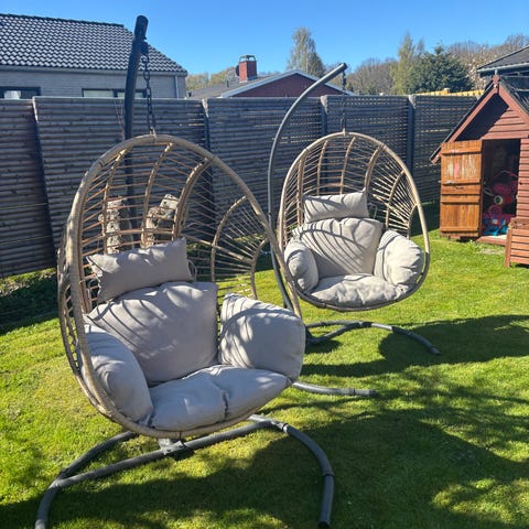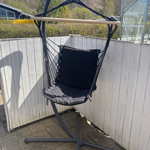 Hængestol i kurvestol-design med fritstående metalstativ. Sædet er udført i flettet materiale i naturfarve og har tykke, lysegrå hynder i både sæde og ryg. Stolen er egnet til brug på altan, terrasse eller indendørs. Den er kun brugt på lukket altan og virkelig vedligeholdt, købt i jysk 2500,- men modellen fås ikke mere, tæppe sælges også til 250,- og bord til 150,- skal afhentes i Herlev