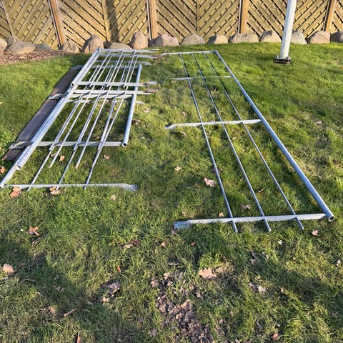Metalgitter og plader til hegn eller indhegning. Sættet består af flere sektioner med lodrette tremmer samt enkelte lukkede plader i blåmalet metal. Elementerne kan anvendes til indhegning, afskærmning eller opdeling af områder, f.eks. på gård eller byggeplads. Sektionerne har beslag i siderne til montering eller sammenkobling. Materialet er kraftigt metal, egnet til udendørs brug med passende vedligeholdelse.