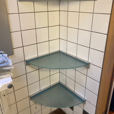 Glassets tykkelse er 1,4 cm og alu skinnen på væggen er 7 cm (mod væggen). På venstre side af alu skinne er der en skrammeflig. Deraf lav pris. Ny pris i butik er ca 3000
