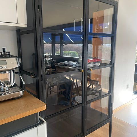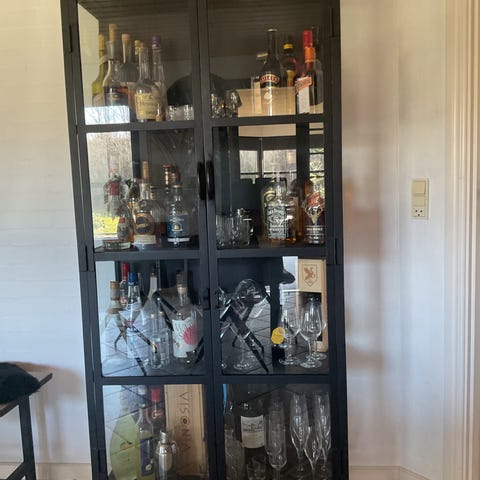 Langt vitrineskab i jern — plads til TV, ledninger & bøger