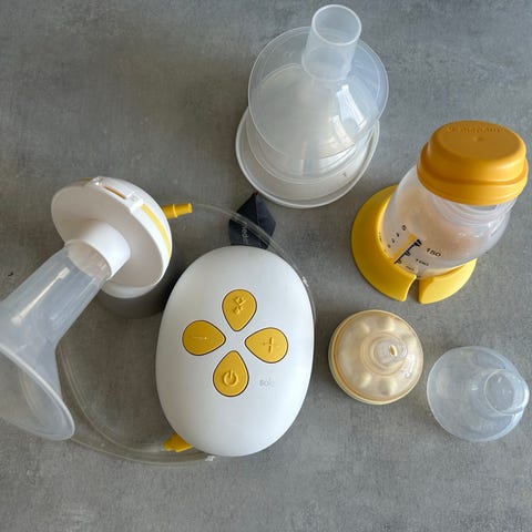 Medela elektrisk brystpumpe med tilhørende flaske. Sættet består af pumpeenhed med betjeningsknapper, brysttragt, beholderdele samt sutteflaske med måleskala. Oplader medfølger. Brugt en enkelt gang.