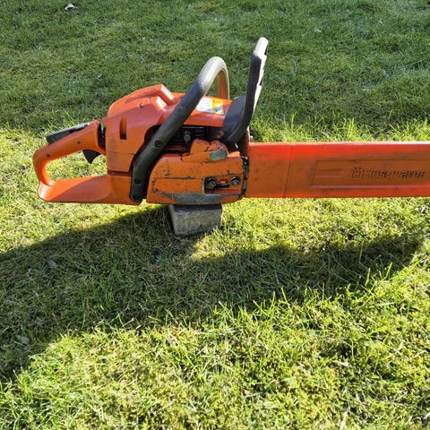 Husqvarna motorsav med sværd i orange farve. Benzindrevet motorsav egnet til træfældning og beskæring i have eller skov. Ny kæde og kun brugt til et større træ.