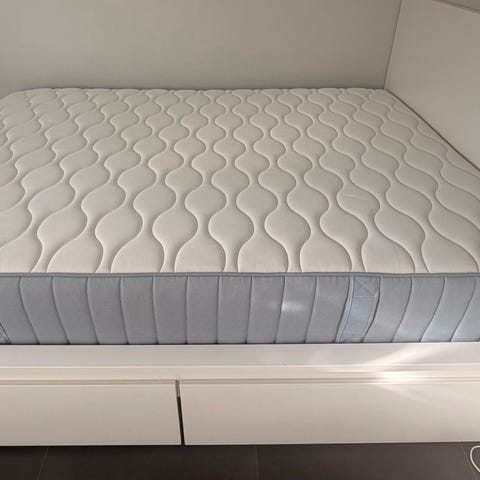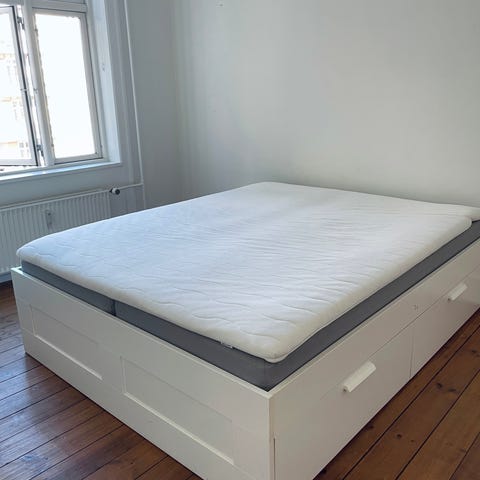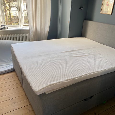 Purskum topmadras 160x200x3,5 cm. Vi havde den her topmadras fra vores gamle seng og har bare lagt den på da den lå i vejen. Man kan få den med hvis man lyster.