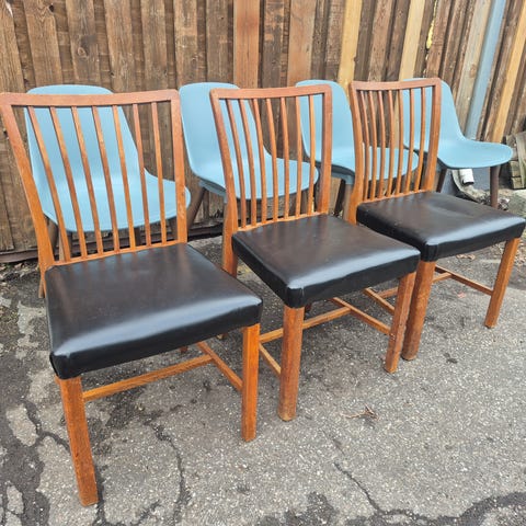 Kurt Østervig spisebordsstole- patineret massivt birketræ og brunt læder. Fra Illums Bolighus i 70'erne. God siddekomfort - patineret men helt funktionelle. Sidde højde 42 cm bredde 48cm højde 78cm. Sæder kan let skrues af, hvis man ønsker at slibe træet elker behandle det. Kun afhentning Frederiksberg