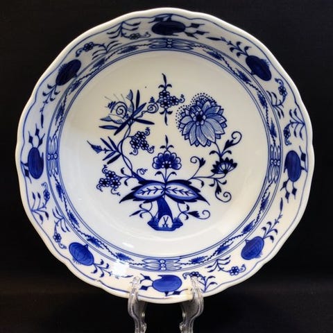 Løgmønster porcelæn, er uden tvivl Meissens mest kendte og kopierede spisestel. Mønstret har også været udført på Royal Copenhagen så tideligt som sidst i 1800 tallet. Det Musselmalede som vi elsker så højt i dag, er en senere forenkling af netop LØGMØNSTERET og i samme blå nuance. Jeg er stor fan, af at bruge mange forskellige blå stel sammen, både i vores tallerkenrækker og borddækning. Syntes det bliver meget mere interessant, når Fattigmands Blå Blomst, Musselmalet, Løgmønster og Mega Mussel blandes.